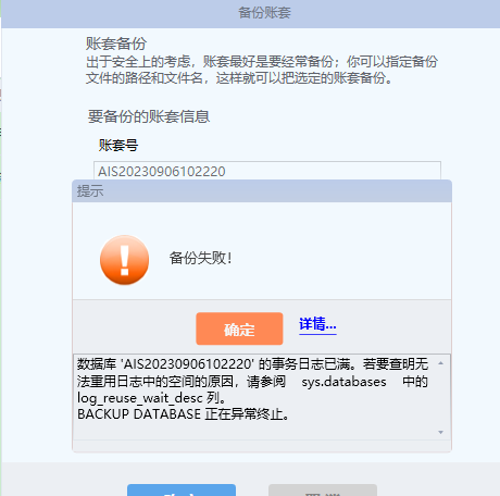 数据库事务日志已满,若要查明无法重用日志中的空间原因,请参阅 sysdatabases 中的log_reuse_wait_desc 列。BACKUP DATABASE 正在异常终止。