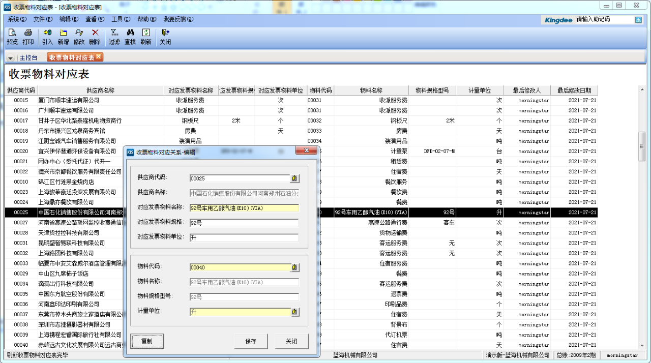 △ 收票物料对应表界面