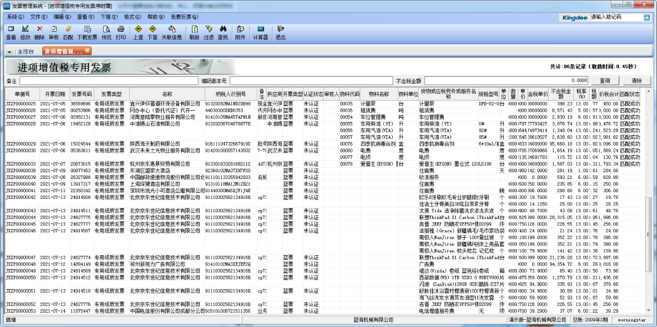 如果完成了前面两个步骤,用户就可以进入「进项增值税发票」界面下载发票,一键匹配供应商、物料、计量单位等信息,下推即可生成外购入库单、采购发票单据。