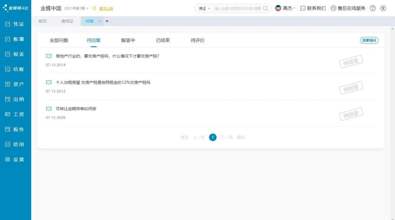 金蝶精斗云的迷你版、标准版产品,在录凭证、查凭证、明细账、科目余额表、结账等财会最常使用的产品功能界面上提供【会计问题,专家解答】按钮,用户点击按钮即可一键发起提问。系统默认向新使用问答服务的账套赠送3张问答卡。