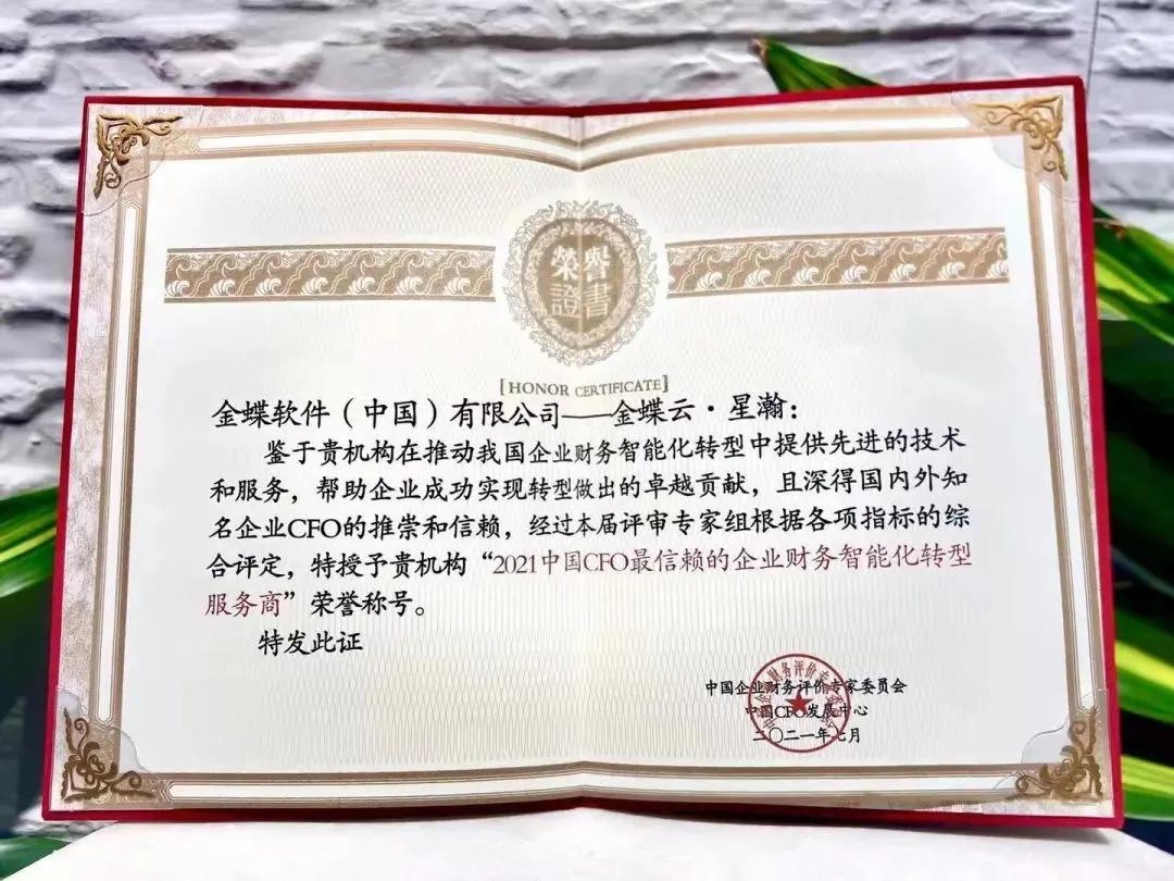 金蝶云·星瀚凭借在推动我国企业财务智能化转型中提供的先进技术和服务,帮助企业成功实现转型做出的卓越贡献,深得国内外知名企业CFO的推崇和信赖,荣膺“2021中国CFO最信赖的企业财务智能化转型服务商”称号。