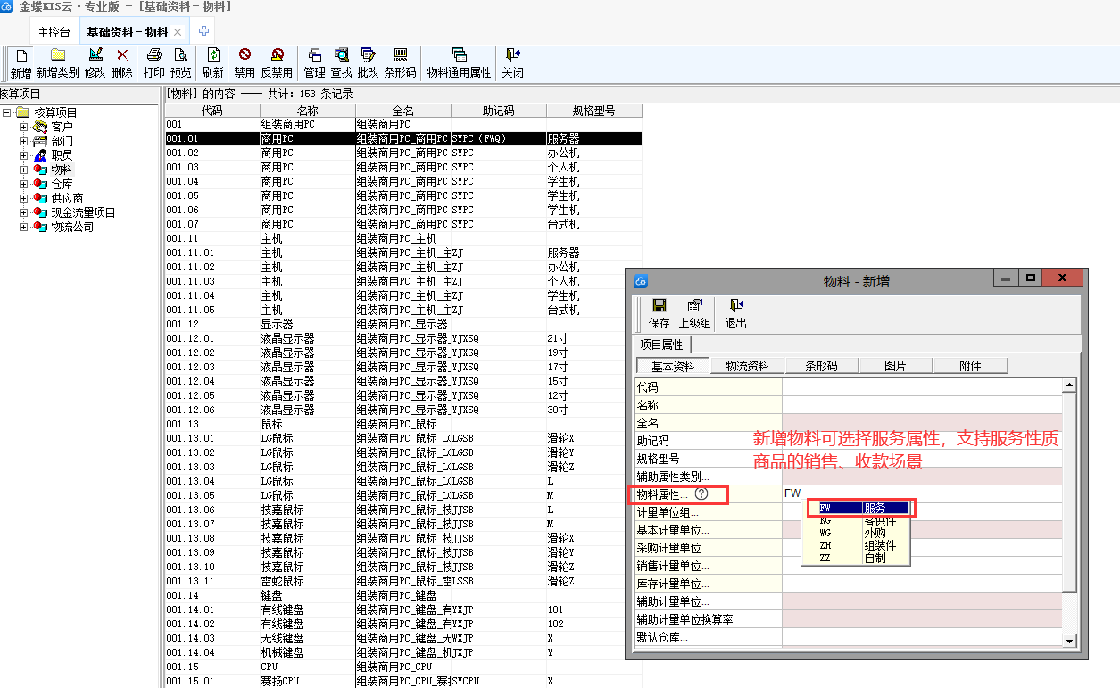 1、物料属性增加“服务”,支持服务性质商品的销售、收款场景