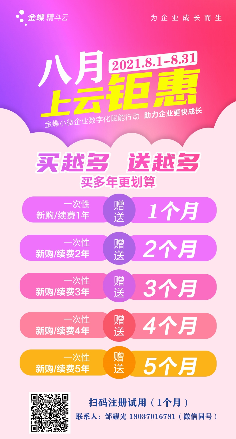 洛阳金蝶软件,洛阳财务软件,2021.8月金蝶精斗云促销活动介绍: