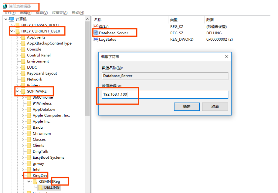 3、因为主机IP/计算机名变动导致的客户端无法登录,在客户端开始——运行,输入regedit打开注册表,定位到HKEY_CURRENT_USER\Software\KingDee\KDReg,找到Database_server,修改服务器ip或计算机名,正确后,重新打开客户端。