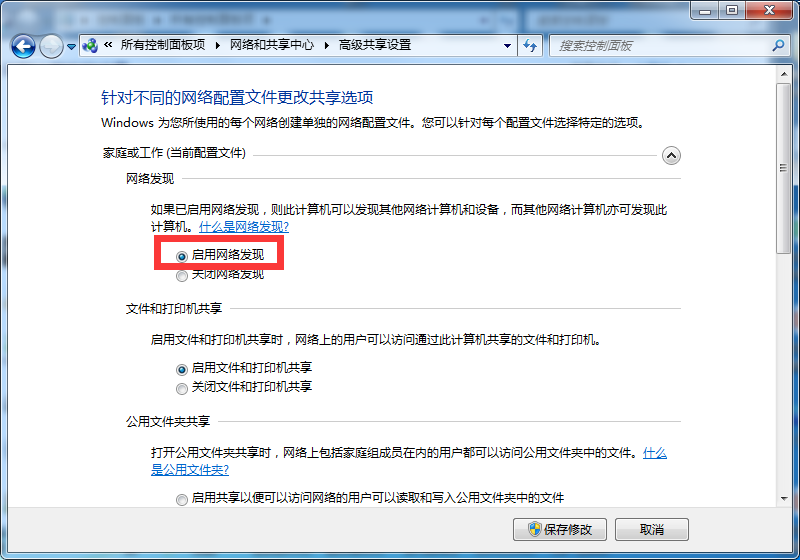 6、检查 主机服务器 网络共享中心——高级共享设置 ,网络发现——选择 【启用网络发现】。