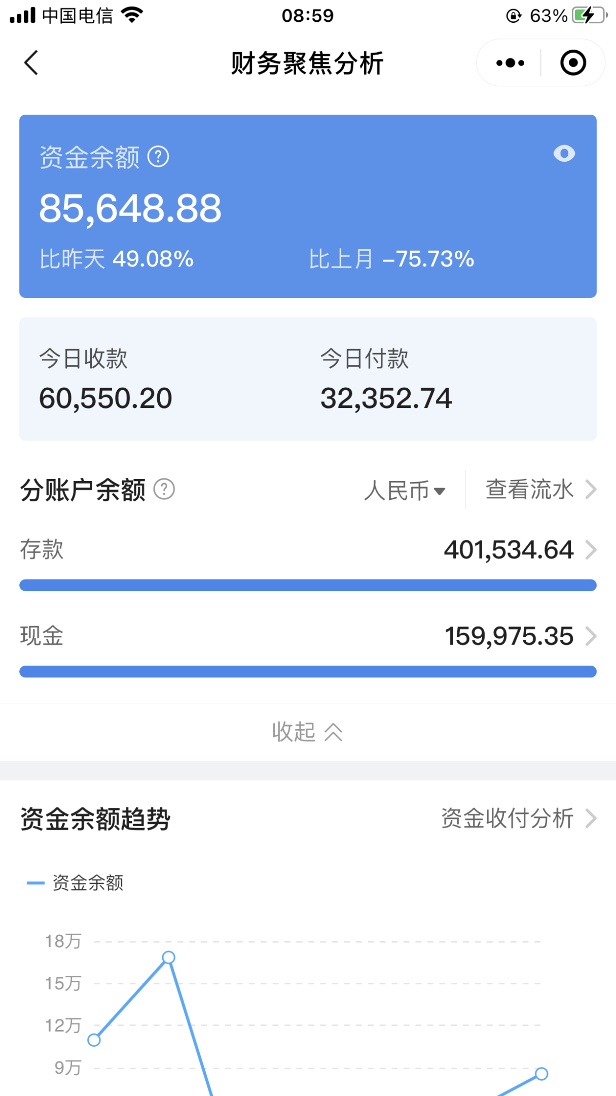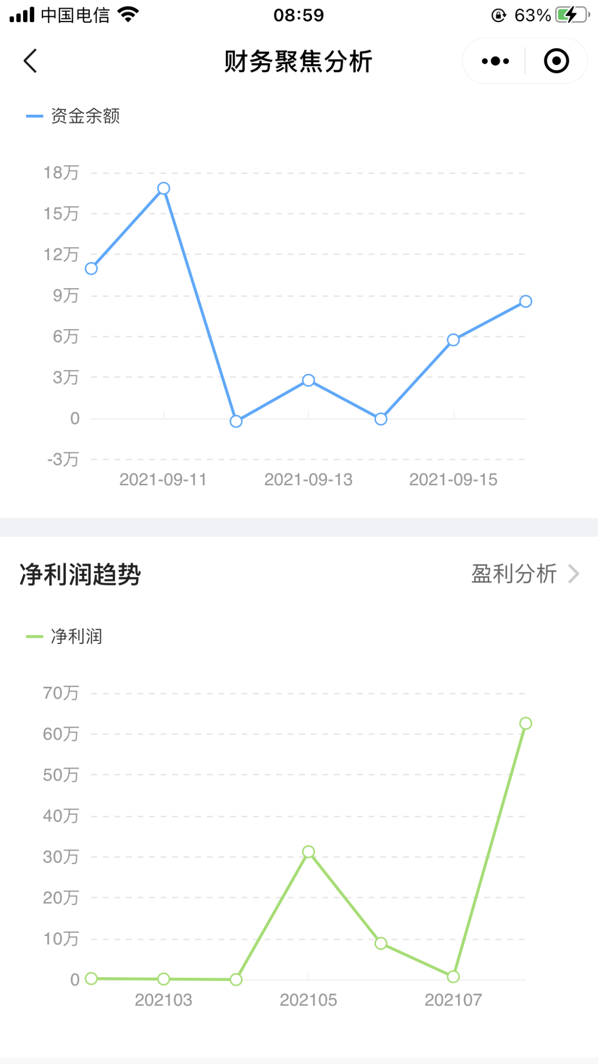 使用金蝶云·星辰后,英姐在微信上打开“老板参谋”小程序,就可以直观的看到企业的资金余额和利润分析,能实时了解企业资金的流向,每个账号还剩多少钱,每个账户的流水明细情况,同时能对企业未来的资金情况进行预测。