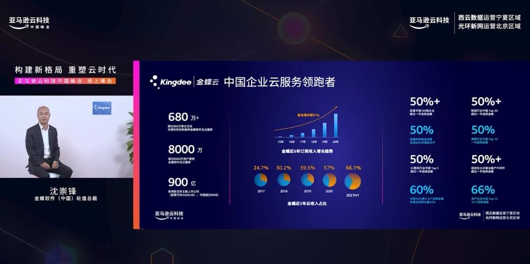 一年一度的行业内顶级峰会亚马逊云科技峰会2021年9月9日-14日于线上召开,本次峰会对焦5大主题演讲、8大技术、9大行业细分领域,并开设多场次行业分论坛,聚合国内外尖端技术讲师和业内领袖及余万名构建者共襄盛会。大会覆盖人群2.5万,主论坛邀约金蝶、保时捷、阿迪达斯、西门子、涂鸦智能5家亚马逊云合作伙伴出席,金蝶中国轮值总裁沈崇锋应邀出席并发表演讲。