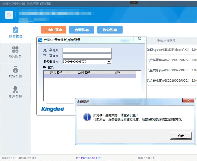问题:金蝶KIS专业版 客户端分机登录,经常出现 金蝶KIS连接, 提示"服务器不是有效的,请重新设置,可能原因:服务器端没有建立账套、加密服务器没有启用或其它" 错误提示 造成登录金蝶软件账套为空。