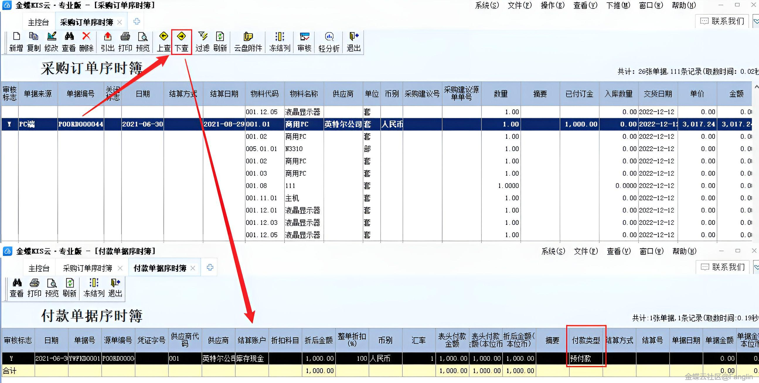 (6)采购/销售订单序时簿支持点击【下查】查看关联的预收预付单据