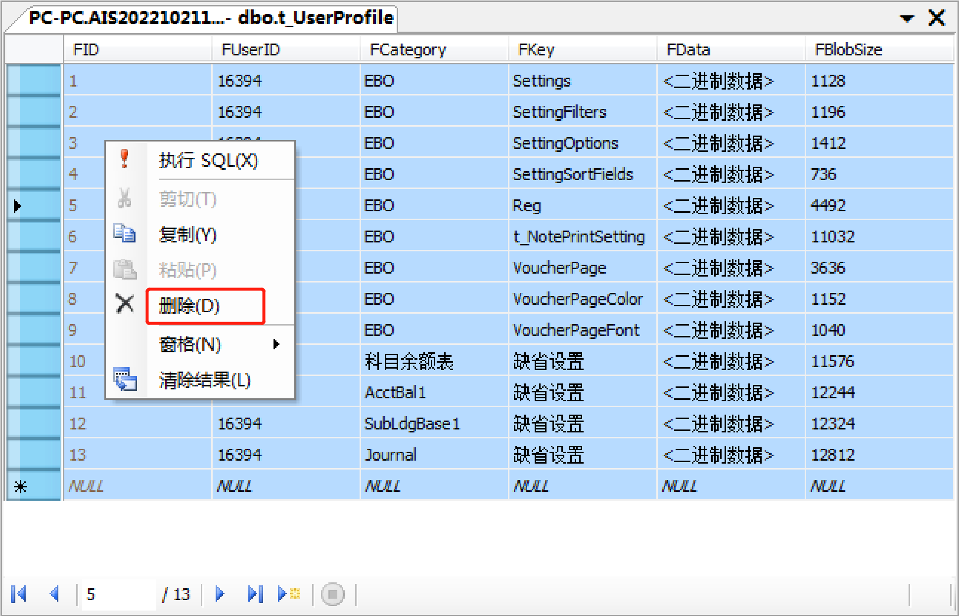 2、userprofile表界面 选中所有行——鼠标“右键”——删除——点 “是”;
