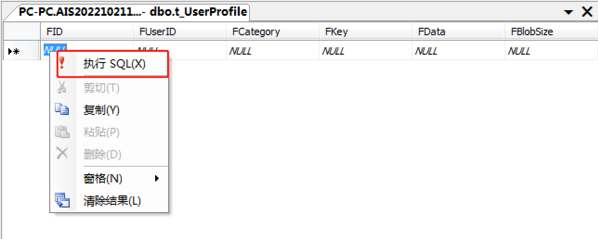 1、登录数据库,账套——表——t_userprofile表——鼠标“右键”——编辑前200行;